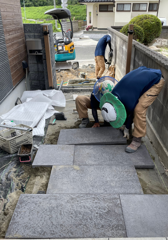 建物の外観カラーや素材感に調和するよう、アプローチには落ち着いたグレー系のタイルを選定。雨の日も滑りにくく、安全で快適な動線を確保しました。