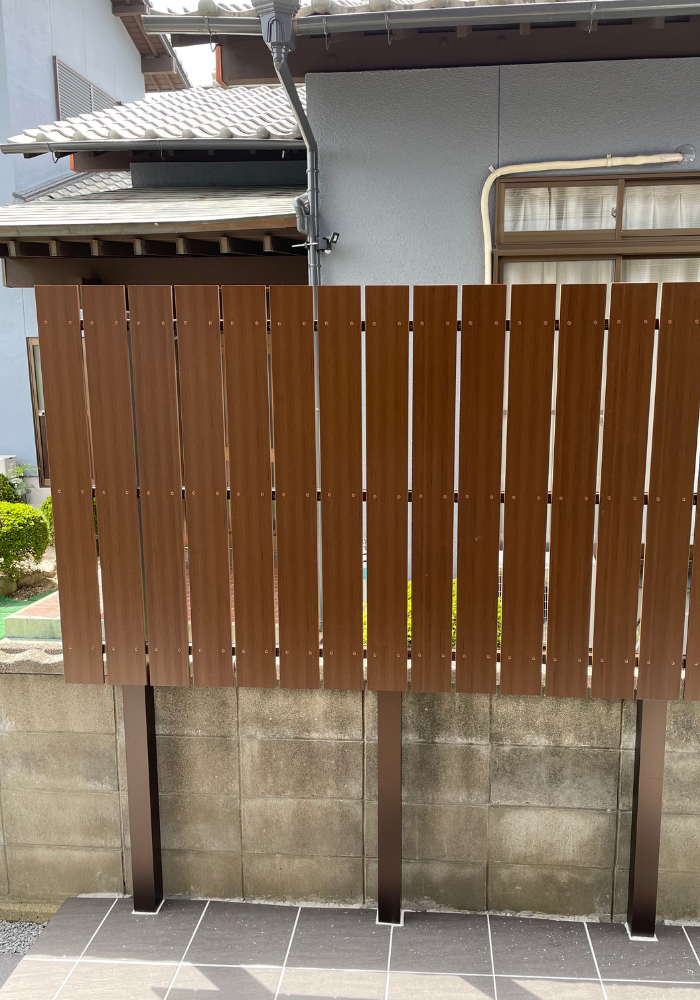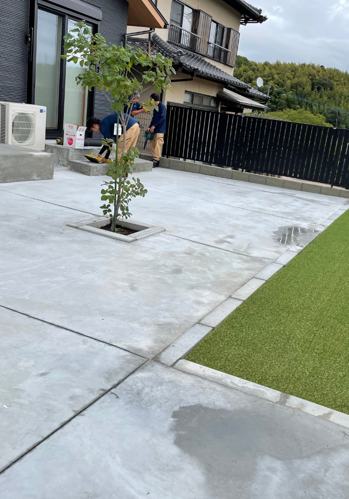 プライバシーを守りつつ開放感を損なわないよう、木調フェンスを設置。庭部分はシンボルツリーと人工芝を組み合わせ、メンテナンス性と景観の両立を図りました。