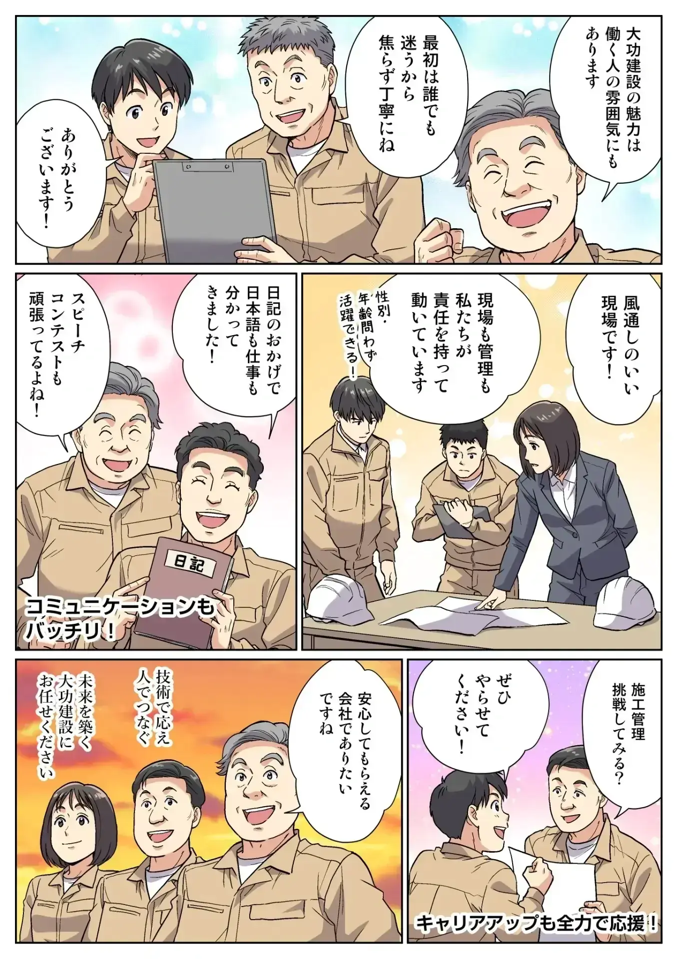 初めての現場仕事に不安はつきもの。大功建設はゼロからの挑戦を応援します。